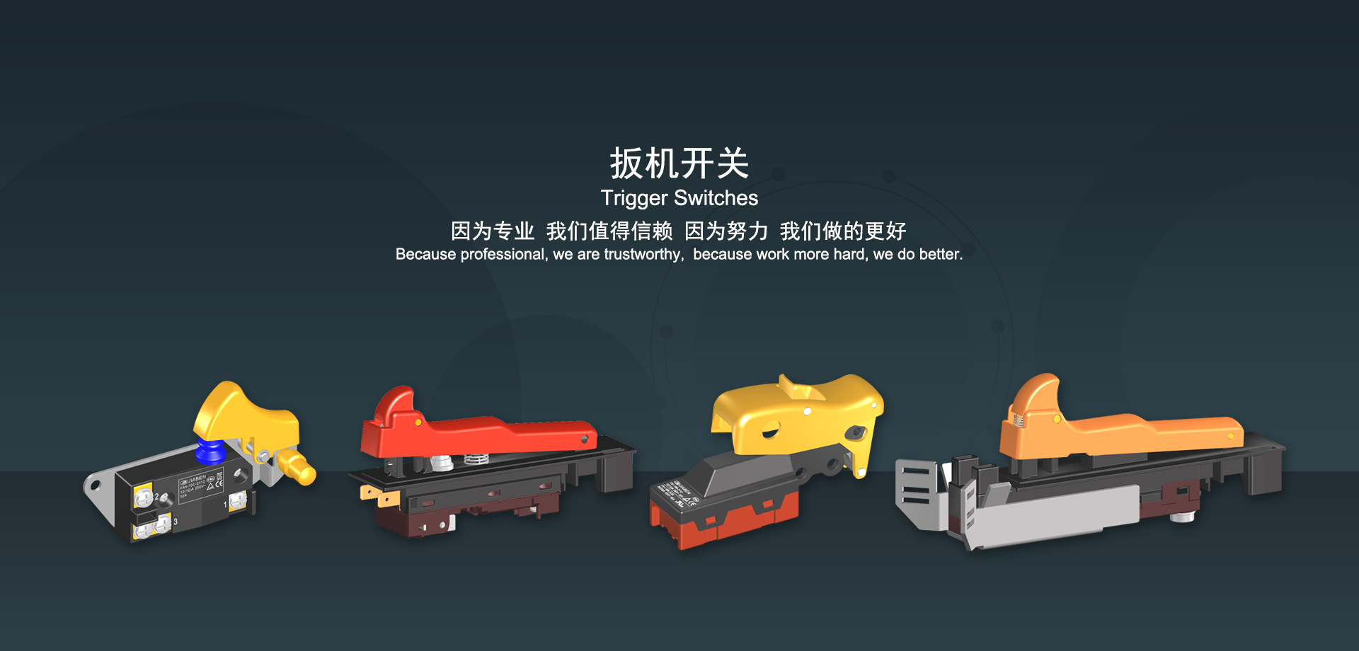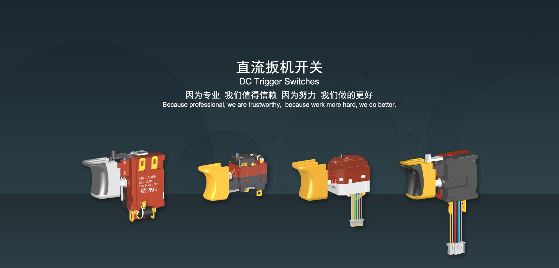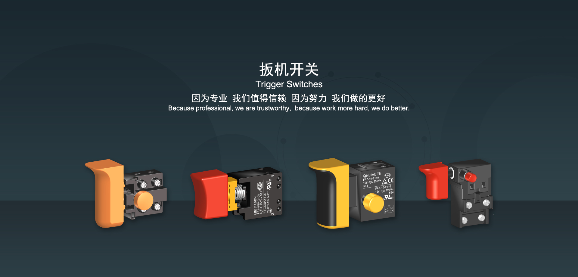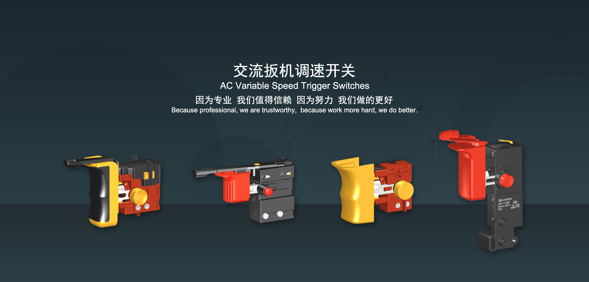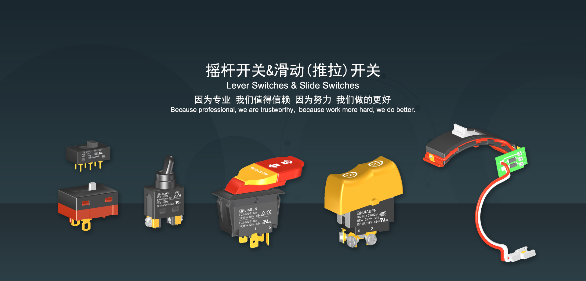 浙江佳奔電子有限公司始建于1986年,坐落于浙江省樂清市虹橋鎮(zhèn)東電子信息產(chǎn)業(yè)園內(nèi),現(xiàn)有職工700多人,資產(chǎn)總額超3億元。公司主要經(jīng)營(yíng)“JIABEN”牌微動(dòng)開關(guān)、蹺板開關(guān)、按鈕開關(guān)、扳機(jī)開關(guān)、調(diào)速開關(guān)和電位器開關(guān)等各類交、直流器具開關(guān)和各類交、直流線路板模塊等產(chǎn)品,主要應(yīng)用于交、直流電動(dòng)工具、電動(dòng)園林工具、清潔器具、家用電器和小型機(jī)床等行業(yè),是集產(chǎn)品設(shè)計(jì)、研發(fā)、制造、銷售和服務(wù)于一體的國(guó)家高新技術(shù)企業(yè)。JIABEN was founded in 1986, located in East Electronic Information Industry Park, Hongqiao Town, Yueqing City, Zhejiang Proviance, existing staff more than 700 peoples, more than 300 million RMB worth of assets. Company is mainly engaged in "JIABEN" brand Micro Switch, Rocker Switch, Push-button Switch, Trigger Switch, Speed Regulating Switch, Potentiometer Switch and other kinds of appliance switch and all kinds of AC or DC circuit board module, such as more than 100 series, 8000 kinds of models of products, mainly used in AC or DC Power-tools, Power Gardening Tools, Cleaning Appliances, Household Appliances and Small Machine Tool and other industries, is the collection product design, research and development, manufacturing, sales and service in one of the national high and new technology enterprise.